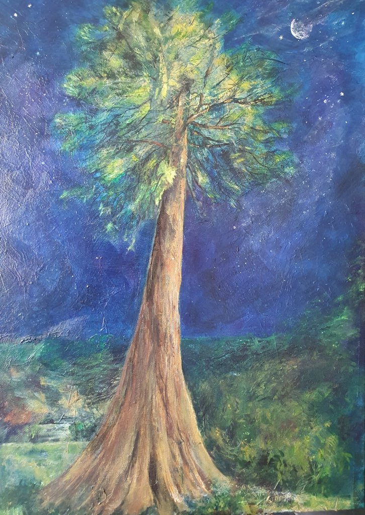 This is a painting of a huge Redwood that lives in Tunbridge Wells. It is a surreally-sized tree, such a magnificent giant. The painting is set as a night scene as the tree bears witness to all the years, stars, moon phases and times in which it has been growing. I thought it wasn’t like anything else that I have painted but looking at it with other pieces I can see that it is mine. Framing in process now….