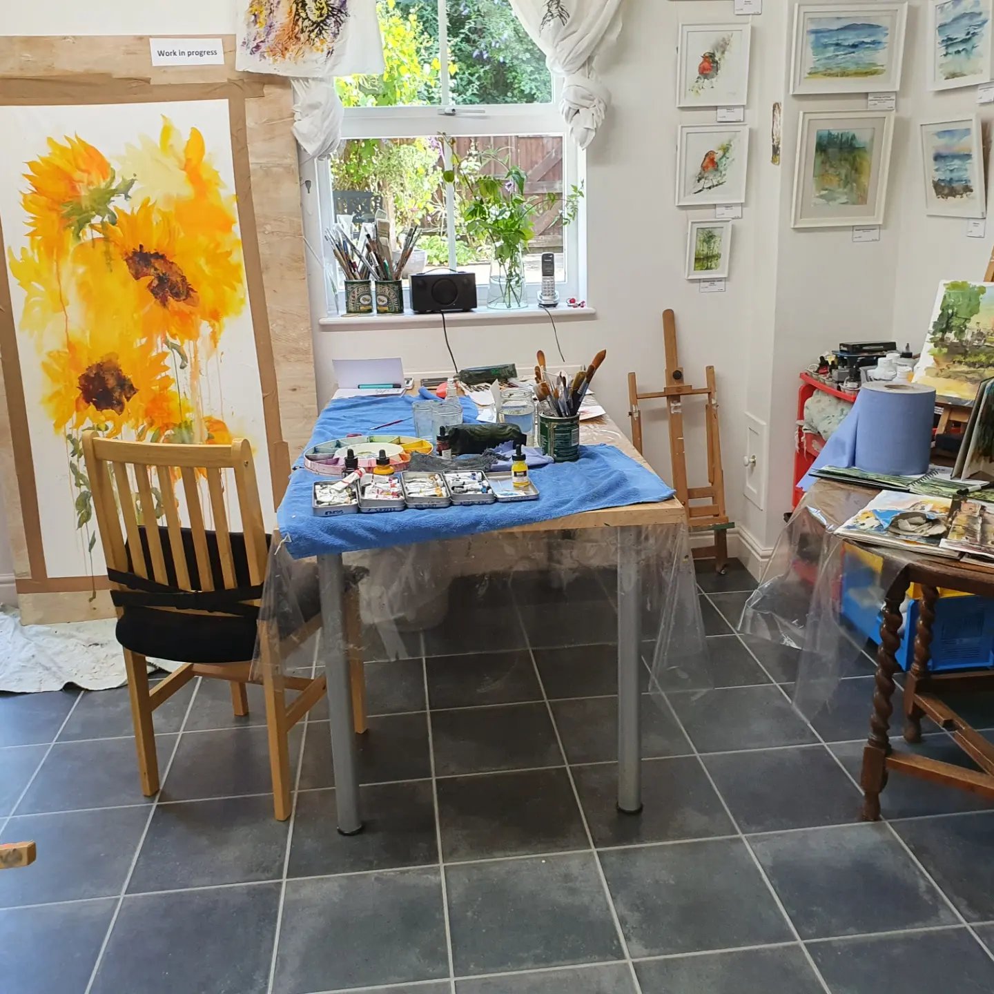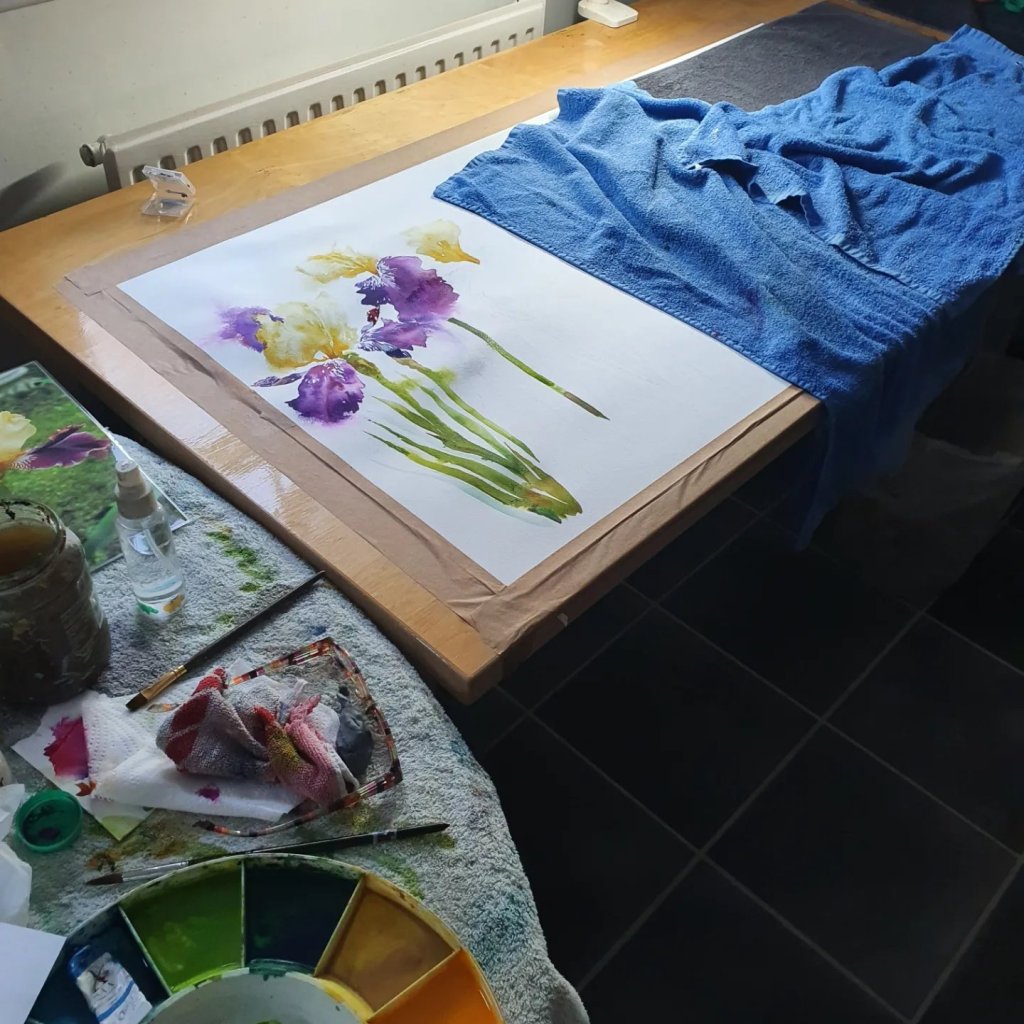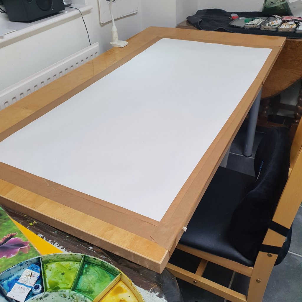 Large sheet stretched always very exciting, I’m protecting areas as I work very slowly in loose watercolour. Really enjoying this so far